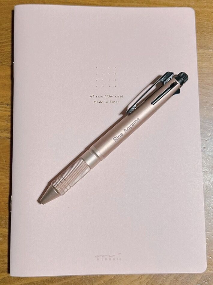 スタイリッシュなノート、私も好きです。ノートとペンの色がコラボしているだけでも素敵なのに、よく見るとペンには「Rina Aoyama」のネームが入っています。毎日を大切に過ごしている感じがすごくイイ!